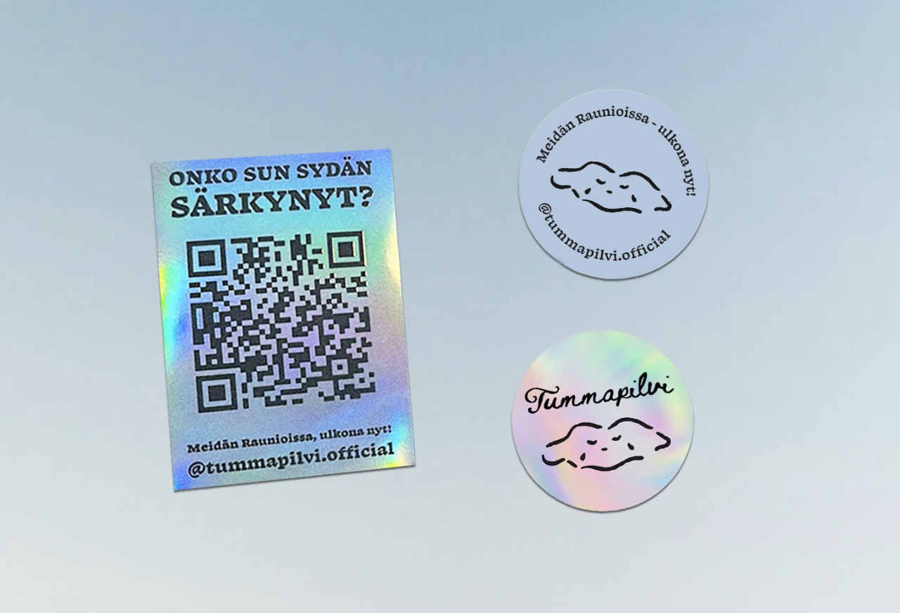 Tummapilven musiikki liikkuu valon pilkahdusten ja pilvien välimaastossa. Syksyllä 2025 aloitimme yhteistyössä artistin kanssa visuaalisen ilmeen suunnittelun. Tavoitteena oli luoda tunnistettava ja omaleimainen kokonaisuus – uskottava, mutta kevyesti kujeileva. Tummapilven ympärille rakentui ensimmäisten sinkkujen Spotify-canvakset sekä julkaisujen yhteydessä jaetut siirtotatuoinnit ja tarrat.